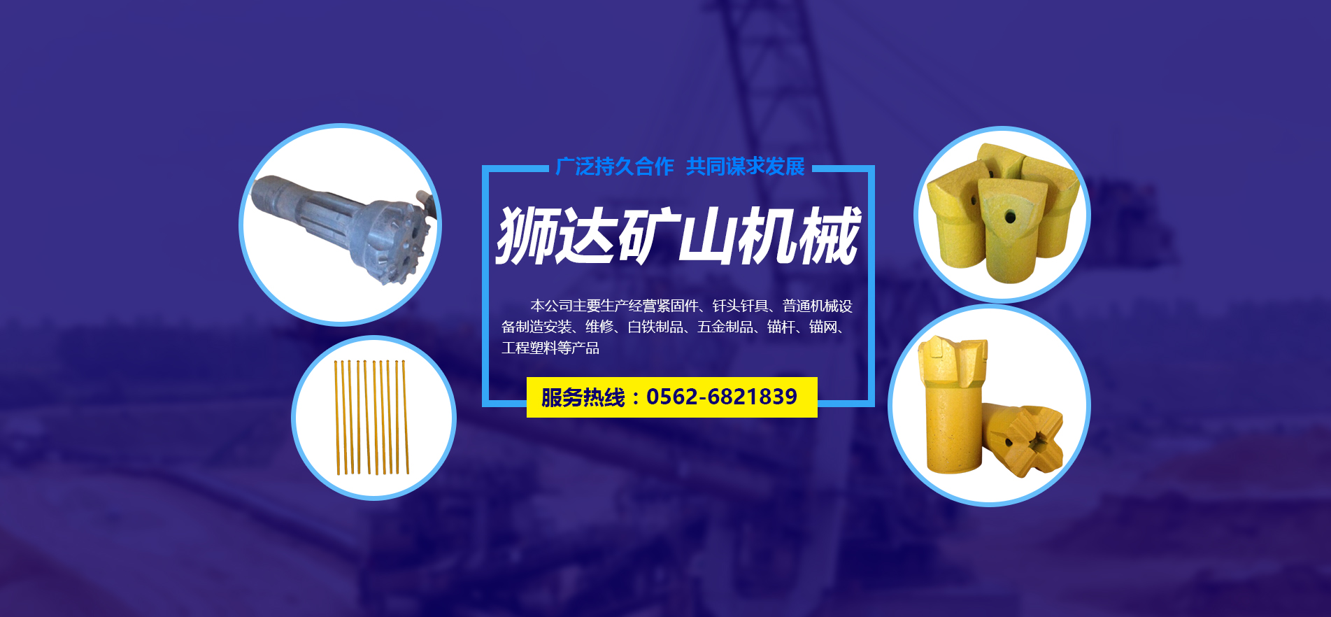 主營緊固件、釬頭釬具、普通機械設備制造安裝、維修、白鐵制品、五金制品、錨桿、錨網(wǎng)、工程塑料等